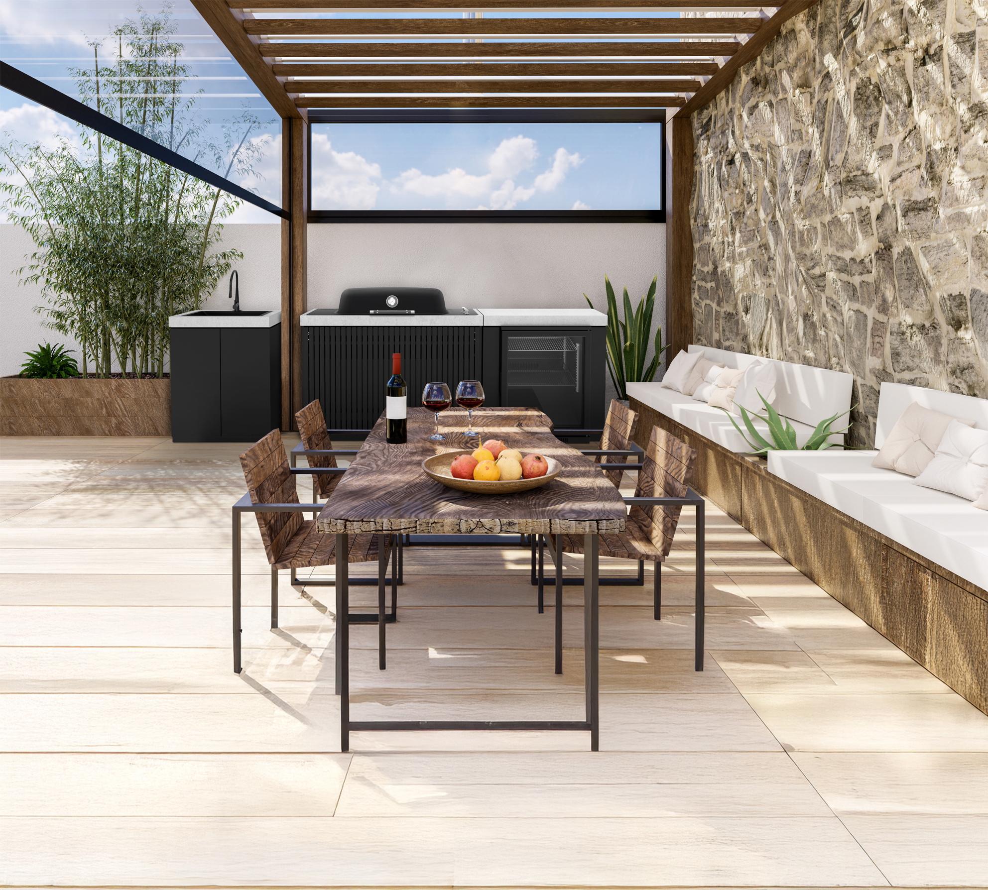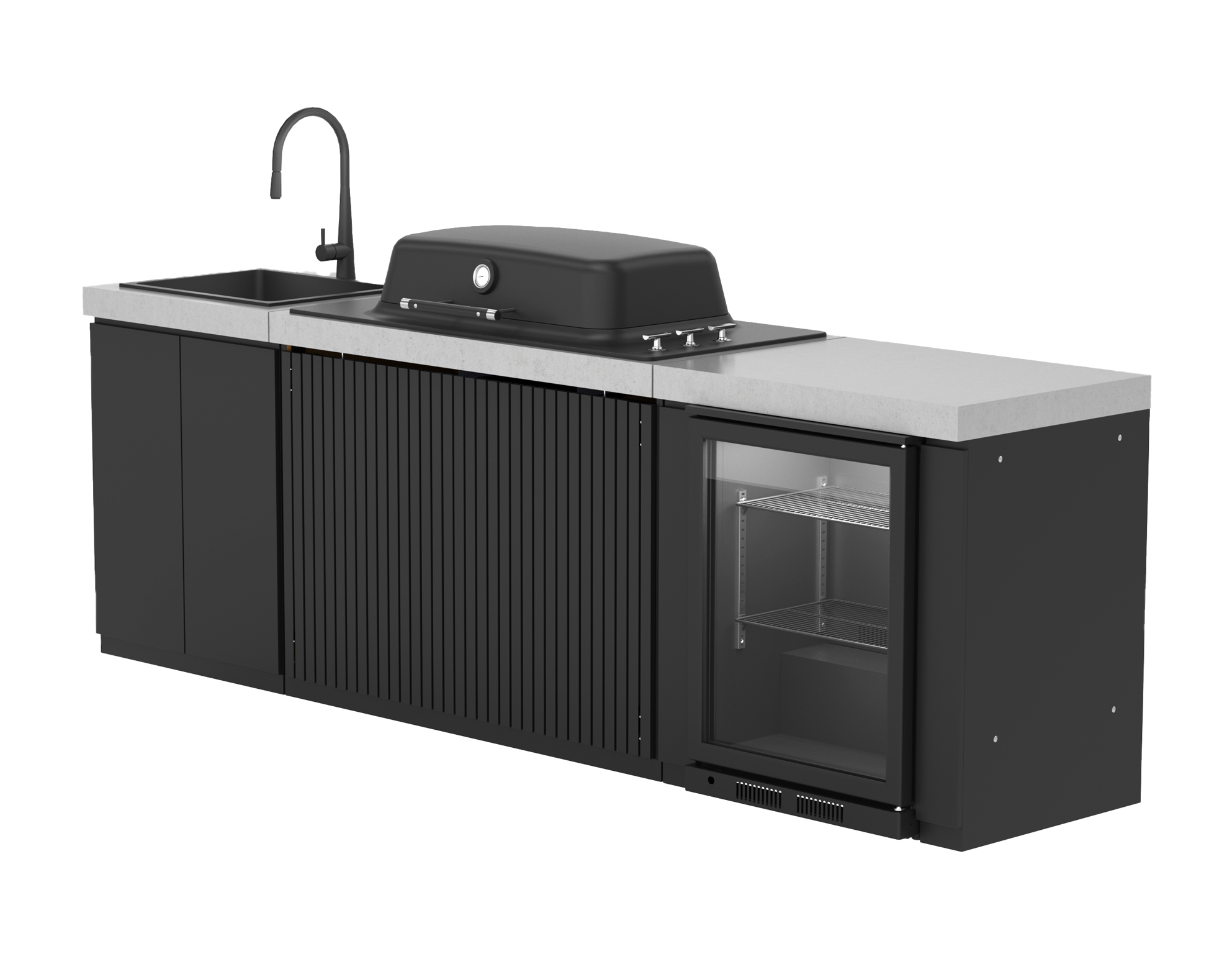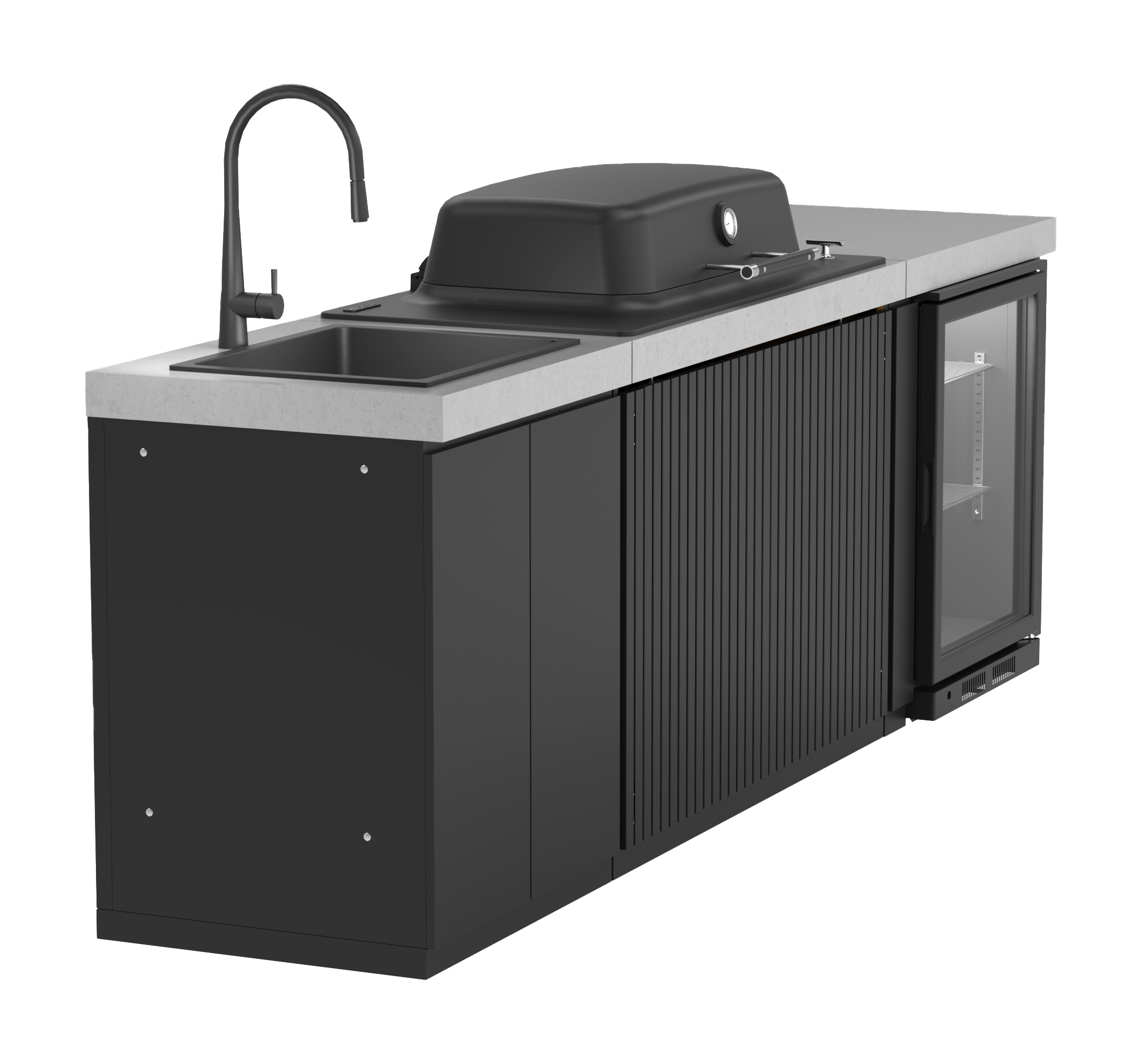 Das Getränkekühlmodul vereint Stil und Funktionalität und wertet Ihren Außenbereich auf. Es ist mit Aluminiumpaneelen in Marinequalität in mattschwarzem Finish ausgestattet und verfügt über eine Sinterstein-Arbeitsplatte, die das ästhetische Design perfekt ergänzt.