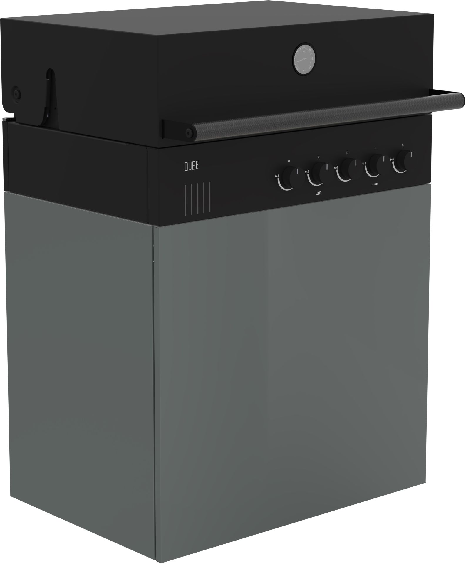 - Bestehend aus QUBE X-415 RB Einbaugrill und einem von 5 verschiedenen BBQ Unterschränken aus Edelstahl mit Pulverbeschichtung (RAL 9005 Black, RAL 3032 Red, RAL7043 Darkbrey, RAL 9001 Creme, RAL 7006 Taupe)