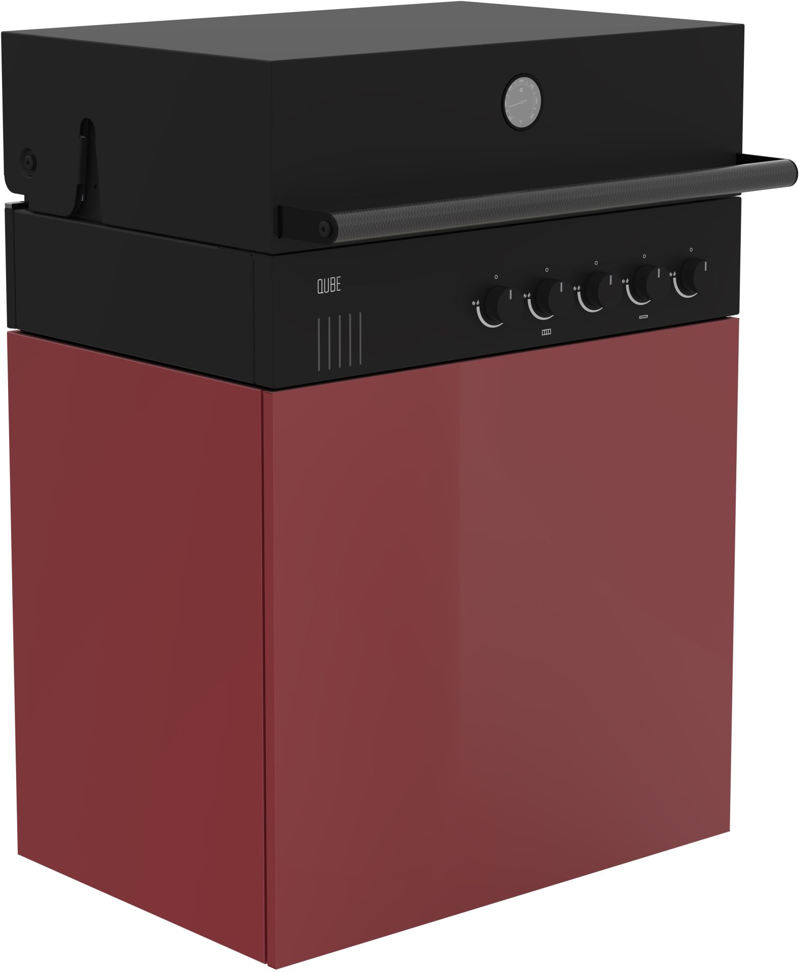 - Bestehend aus QUBE X-415 RB Einbaugrill und einem von 5 verschiedenen BBQ Unterschränken aus Edelstahl mit Pulverbeschichtung (RAL 9005 Black, RAL 3032 Red, RAL7043 Darkbrey, RAL 9001 Creme, RAL 7006 Taupe)