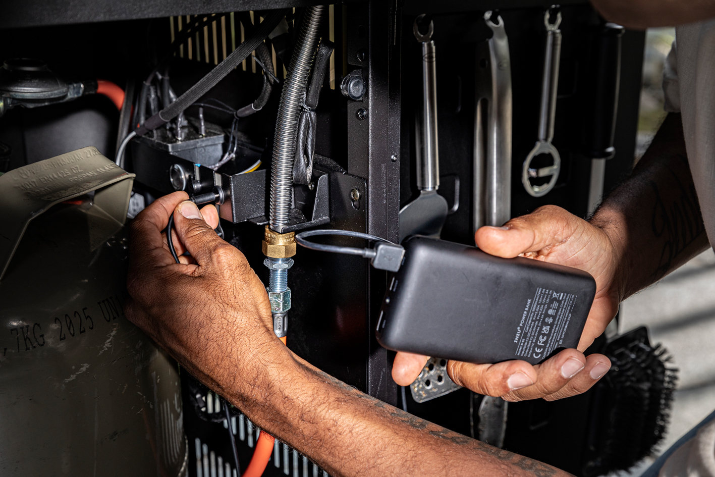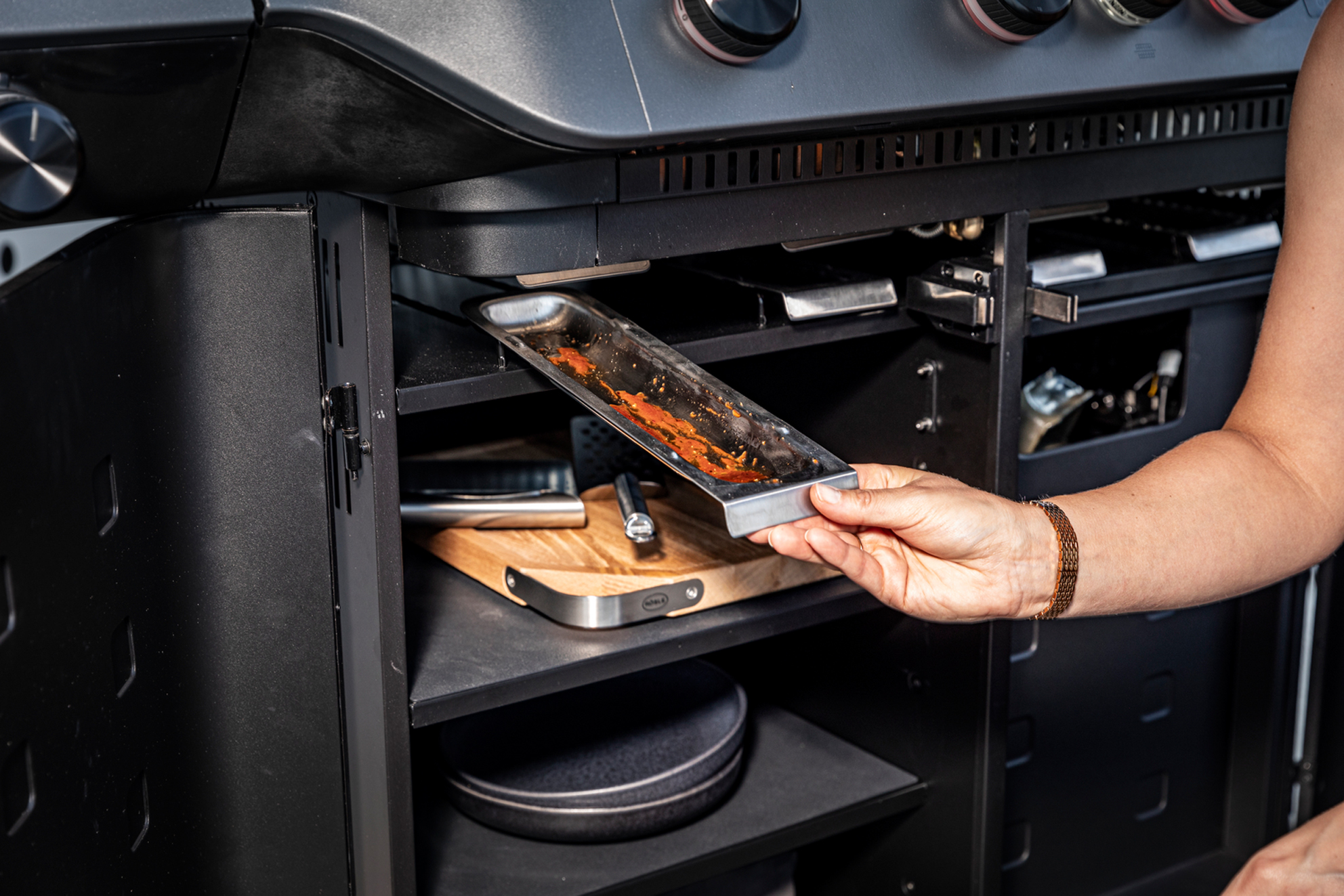 - Gasflasche clever hiinter einer abnehmbaren Abdeckung verstaut, inklusive Schienen und Klettband zur sicheren Fixierung