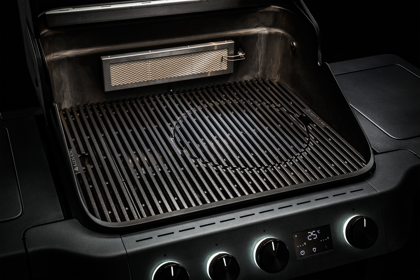 - Auch bei geöffnetem Deckel wird die Brennkammer optimal ausgeleuchtete, das Licht strahlt von oben auf die Grillroste